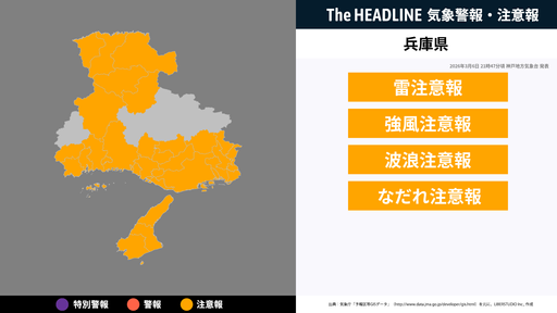 3月6日21時47分頃、兵庫県の雷注意報・強風注意報などが更新
