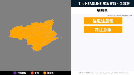 3月6日21時38分頃、徳島県に強風注意報・霜注意報が発表
