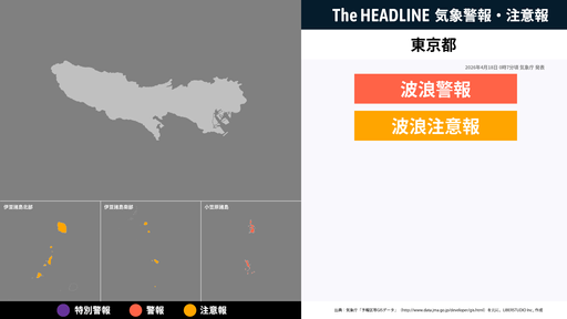 4月18日0時7分頃、東京都に波浪警報・波浪注意報が発表