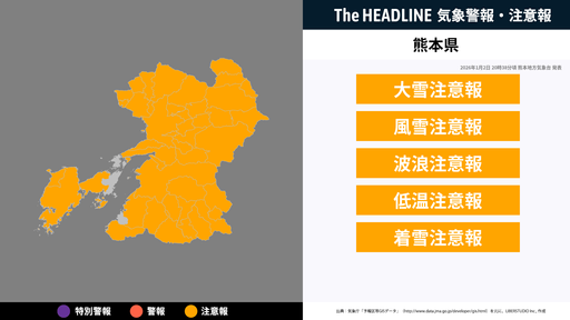 1月2日12時40分頃、広島県に大雪注意報・風雪注意報などが発表