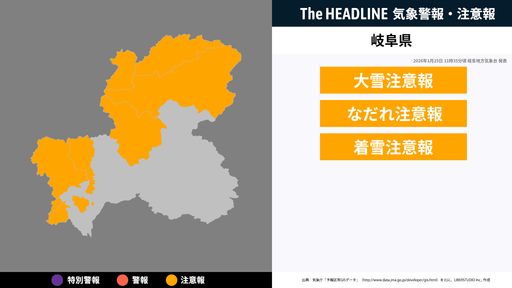 1月25日11時35分頃、岐阜県に大雪注意報・なだれ注意報などが発表