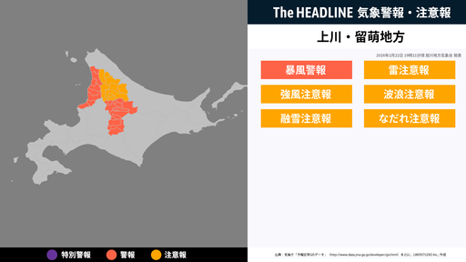 2月22日19時21分頃、上川地方・留萌地方に暴風警報・雷注意報などが発表