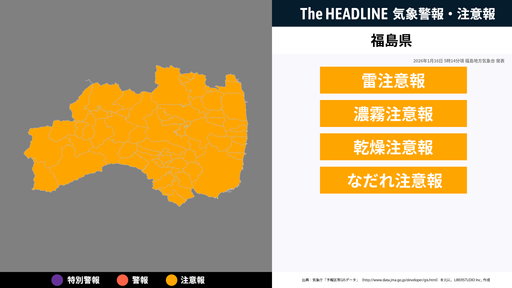 1月16日5時14分頃、福島県の雷注意報・濃霧注意報などが更新