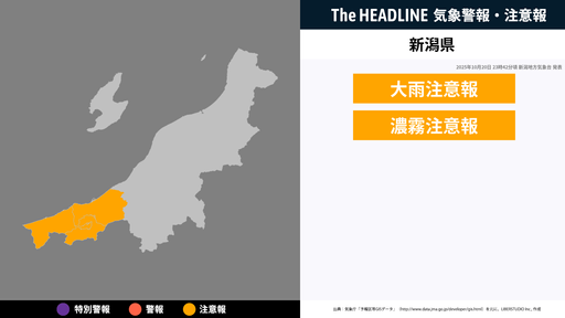 10月20日23時42分頃、新潟県に大雨注意報・濃霧注意報が発表