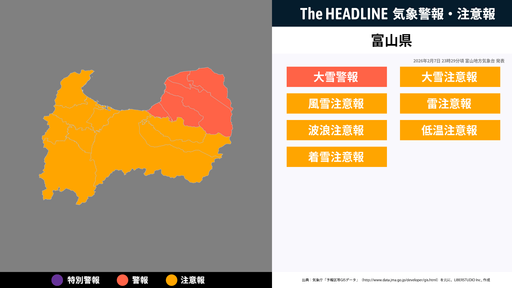 2月7日23時29分頃、富山県に大雪警報・大雪注意報などが発表