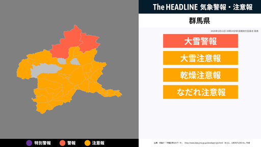 1月11日20時14分頃、群馬県の大雪警報・大雪注意報などが更新