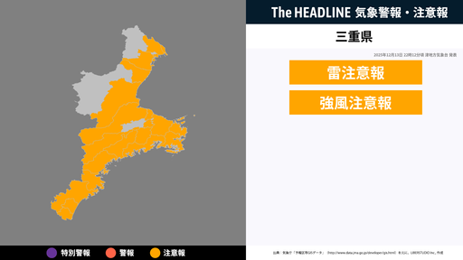 12月13日22時12分頃、三重県に雷注意報・強風注意報が発表