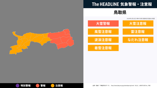1月22日3時47分頃、鳥取県の大雪警報・大雪注意報などが更新