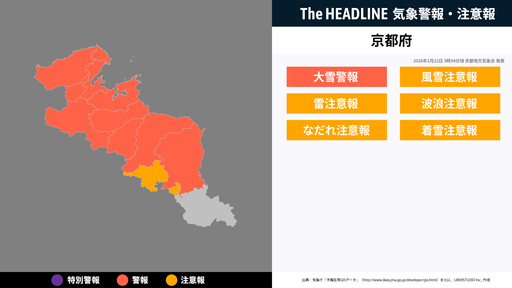 1月22日3時54分頃、京都府の大雪警報・風雪注意報などが更新