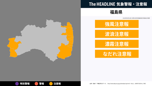 4月16日1時54分頃、福島県に強風注意報・波浪注意報などが発表