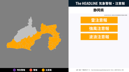 1月2日14時44分頃、静岡県に雷注意報・強風注意報などが発表