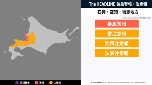 12月1日13時20分頃、石狩地方・空知地方・後志地方の暴風警報・雷注意報などが更新