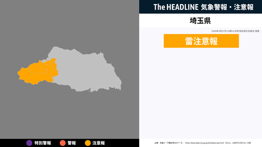 現在起こっている気象現象が、どのくらい先まで予想されているかを示している。色分けは、特別警報級・警報級・注意報級と危険度別をあらわす。