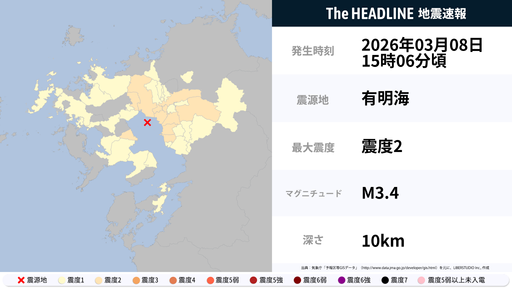 3月8日15時6分頃、福岡県・佐賀県などで最大震度2の地震を観測