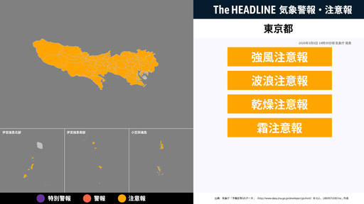 3月8日14時39分頃、東京都の強風注意報・波浪注意報などが更新