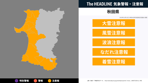 12月12日20時28分頃、秋田県に大雪注意報・風雪注意報などが発表