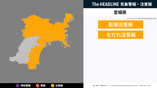 12月12日20時36分頃、宮城県に乾燥注意報・なだれ注意報が発表