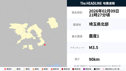 2月9日21時28分頃、栃木県・群馬県などで最大震度1の地震を観測