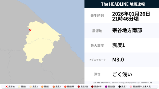 1月26日21時46分頃、北海道で最大震度1の地震を観測