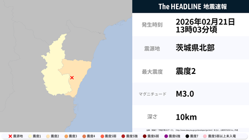 2月21日13時3分頃、茨城県で最大震度2の地震を観測