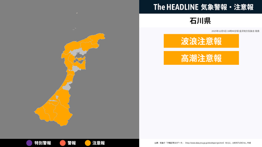 12月5日16時46分頃、石川県に波浪注意報・高潮注意報が発表