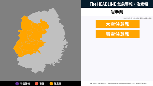 12月9日16時40分頃、岩手県に大雪注意報・着雪注意報が発表