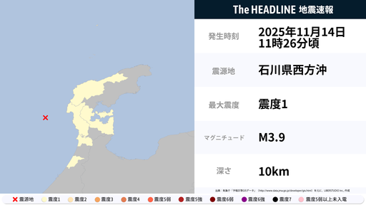 11月14日11時26分頃、石川県で最大震度1の地震を観測
