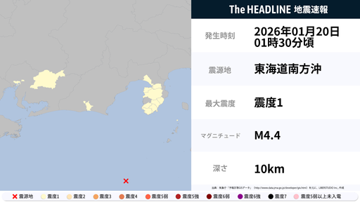 1月20日1時30分頃、東京都・静岡県などで最大震度1の地震を観測