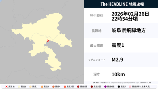 2月26日22時54分頃、長野県・岐阜県で最大震度1の地震を観測