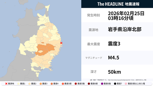 2月25日3時16分頃、岩手県で最大震度3の地震を観測