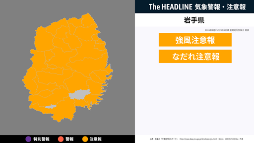 2月25日3時3分頃、岩手県に強風注意報・なだれ注意報が発表