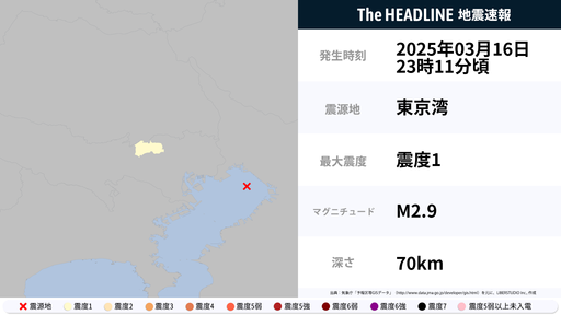 3月16日23時11分頃、東京都で最大震度1の地震を観測