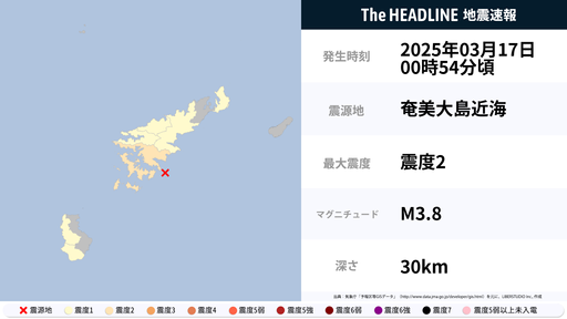 3月17日0時54分頃、鹿児島県で最大震度2の地震を観測