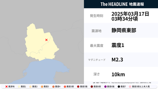 3月17日3時35分頃、静岡県で最大震度1の地震を観測