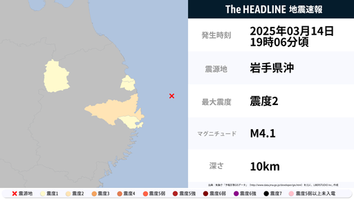 3月14日19時6分頃、岩手県で最大震度2の地震を観測