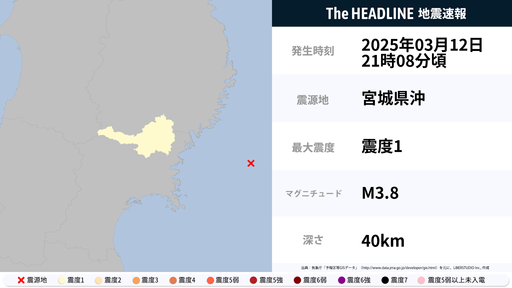 3月12日21時8分頃、岩手県で最大震度1の地震を観測