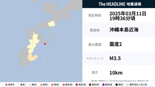 3月11日19時36分頃、沖縄県で最大震度2の地震を観測