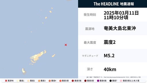 3月11日11時11分頃、鹿児島県で最大震度2の地震を観測