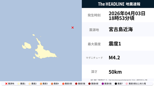 4月3日18時53分頃、沖縄県で最大震度1の地震を観測