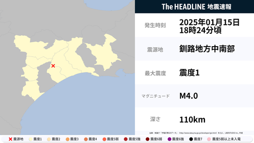 1月15日18時24分頃、北海道で最大震度1の地震を観測