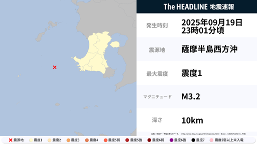 9月19日23時1分頃、鹿児島県で最大震度1の地震を観測