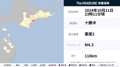 10月21日23時11分頃、北海道で最大震度2の地震を観測
