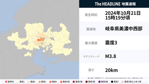 10月21日15時19分頃、愛知県で最大震度3の地震を観測