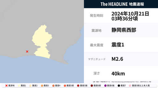 10月21日3時36分頃、静岡県で最大震度1の地震を観測