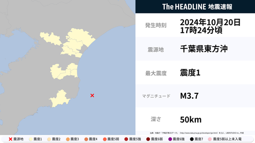 10月20日17時24分頃、千葉県で最大震度1の地震を観測