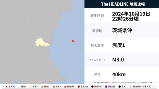 10月19日22時26分頃、茨城県で最大震度1の地震を観測