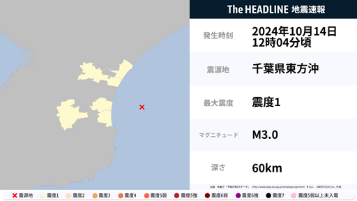 10月14日12時4分頃、千葉県で最大震度1の地震を観測