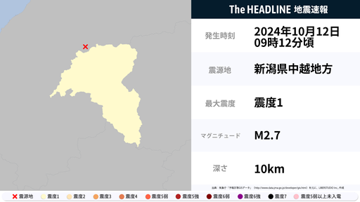 10月12日9時12分頃、新潟県で最大震度1の地震を観測