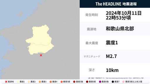 10月11日22時53分頃、和歌山県で最大震度1の地震を観測