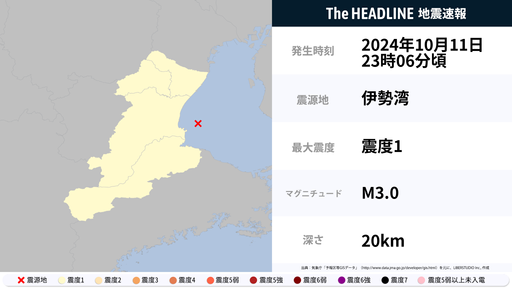 10月11日23時6分頃、三重県で最大震度1の地震を観測